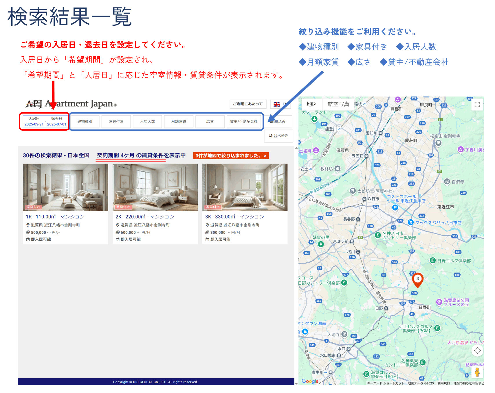 御希望の場所、日付、賃貸期間で、もしくは条件なしで物件を検索してください。